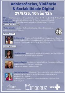 Participe do evento “Adolescência, Violência & Sociabilidade Digital” que acontece dia 29 de agosto, de 10h às 14h, no IFF/Fiocruz, no Centro de Estudos Olinto de Oliveira (CEOO) – Anfiteatro A, localizado no Rio de Janeiro.